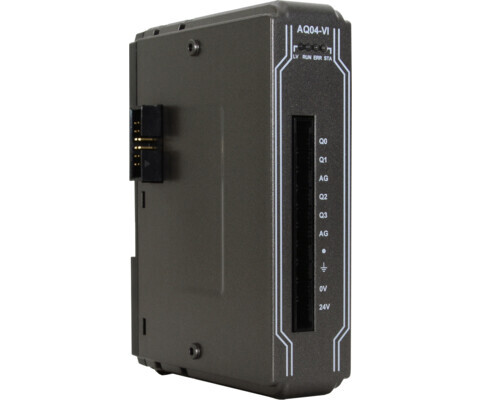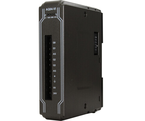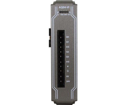 Модуль iR-AQ04-VI серії iR від Weintek призначений для формування аналогових сигналів напруги та струму у промислових системах автоматизації. Він використовується для керування виконавчими механізмами — частотними перетворювачами, клапанами, позиціонерами, електроприводами та іншими пристроями, які потребують аналогового керуючого сигналу.